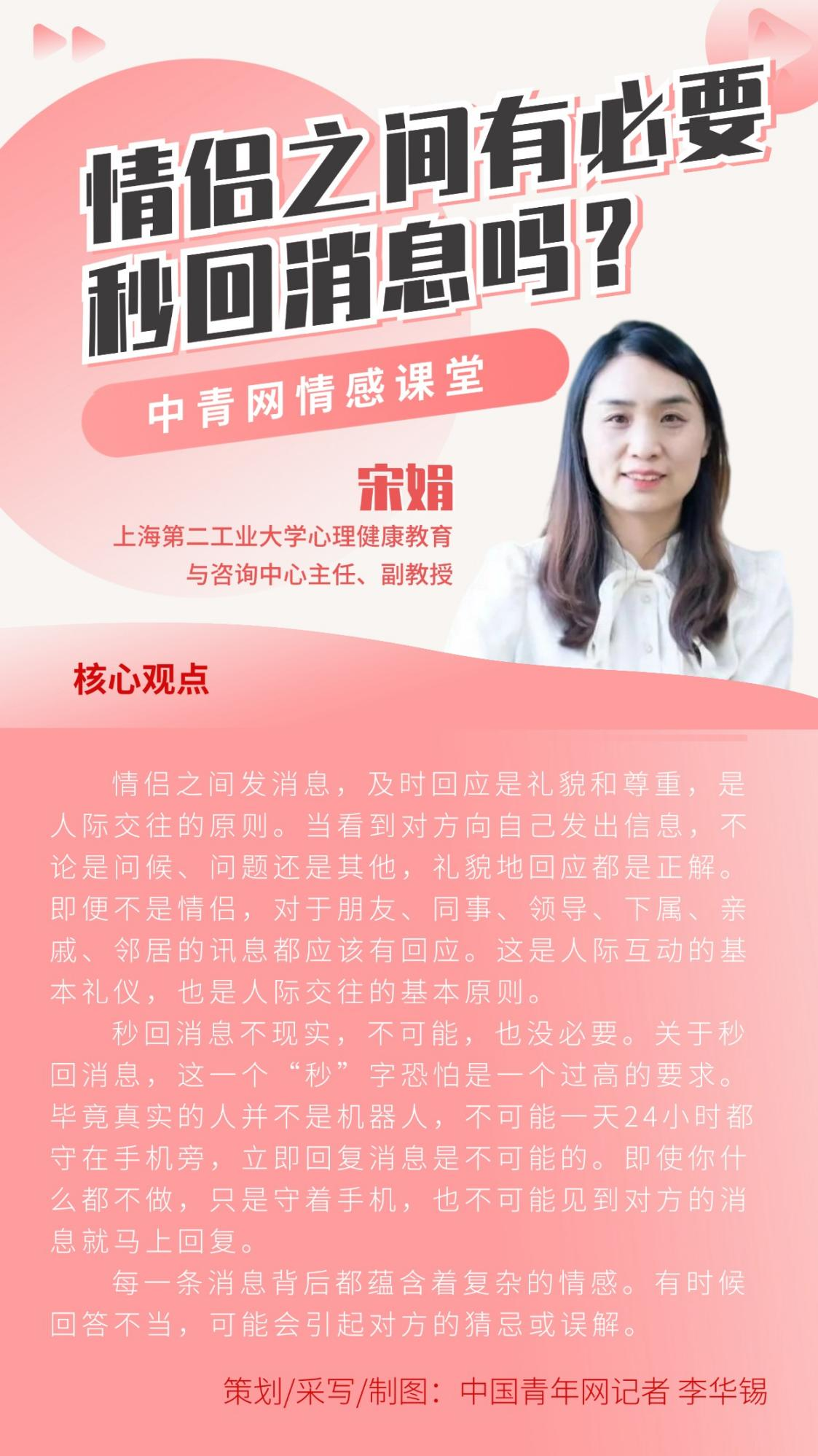 中国青年网北京4月15日电(记者 李华锡)如今,手机就像每个人的手一样不可或缺。一想起对方,就迫不及待地发个消息,然后期待着对方的回应。这似乎是热恋期的情侣经常出现的情景。那么,情侣之间真的有必要秒回消息吗?情侣之间回消息需要注意什么?中国青年网记者专访了上海第二工业大学心理健康教育与咨询中心主任、副教授,中国心理学会注册心理师宋娟,为青年答疑解惑。